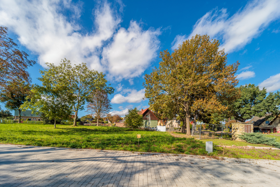 Bebauung ist von klassisch bis modern in (fast) allen Varianten möglich, der Bebauungsplan gestattet eine Bauweise bis 2,5 Geschosse. Die Grundstücke sind über die noch entstehende Anliegerstraße „Joachim-Herrmann-Ring“ zu erreichen (außer 21 und 22 über Hauptstraße/Hackebornstraße).