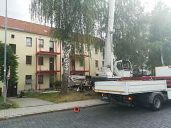 Die Fassade erstrahlt wieder in neuer Farbe, die Balkone sind bereits angebaut. Zum Abschluss der Arbeiten werden noch die Terrassen in den Erdgeschosswohnungen fertiggestellt.