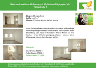 In der Tölpestraße kann eine komplett renovierte und moderne Wohnung bezogen werden. Ein neues Bad, neue Tapeten, euerBodenbelag und neue und moderne Fliesen finden Sie hier. Inhaber eines Wohnberechtigungsscheines können diese Wohnung anmieten. Gern beraten wir Sie. Hier können Sie sich das Exposé anschauen: Tölpestraße 9