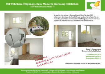 Hier ist alles neu gemacht. 3 Zimmer, ein modernen Bodenbelag, ein neues Bad, neue Türen und neue Tapeten warten auf Sie. Hier werden Sie sich wohl fühlen. Das Angebot ist für Inhaber eines Wohnberechtigungsscheins. Ob Sie Anspruch haben, können Sie gern bei uns erfragen. Zum Wohnungsangebot: Plümickestraße 17