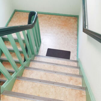 Auch in der Katharinenstraße 39 wurde das Treppenhaus neu renoviert. Die alten Tapeten wurden entfernt und durch neue ersetzt. Es erstrahlt in einem zarten grün. Passend dazu wurde das Treppengeländer neu gestrichen und der Bodenbelag gegen einen hochwertigen PVC-Belag getauscht.