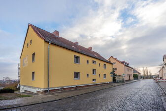 Die Fassade in der Martinsstraße 28 erstrahlt in einem hellen und freundlichen gelb. Nicht zu übersehen. Aus dem tristen Haus mit bröckelnder Fassade ist ein hübsch anzusehendes, modernes und energetisch saniertes Wohnhaus entstanden. Der Sockelbereich muss noch fertig gestellt werden. Dann beginnen wir mit den Sanierungsmaßnahmen im Hausflur.