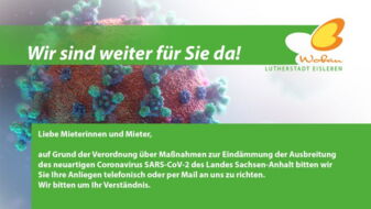 Liebe Mieterinnen und Mieter, liebe Wohnungsinteressenten, auf Grund der aktuellen Lage müssen auch wir entsprechend notwendige Maßnahmen ergreifen, um Sie und uns zu schützen. Damit möchten auch wir unseren Beitrag leisten, die Verbreitung des COVID-19 zumindest zu verlangsamen Zum Schutz unserer Mitarbeiter und zu Ihrem eigenen Schutz bitten wir deshalb darum, nur in absolut dringenden Fällen in unserem Büro persönlich vorzusprechen. Wir sind telefonisch und per Email erreichbar …