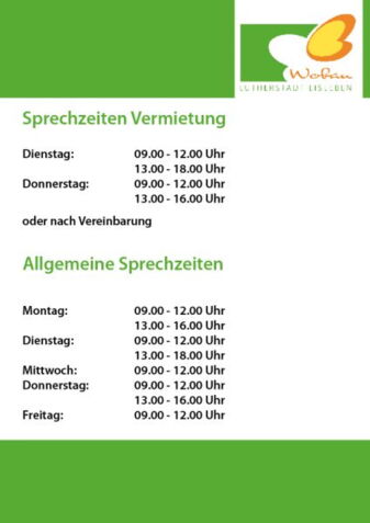 Damit wir flexibler auf die Wünsche unserer Kunden eingehen können, haben wir die Öffnungszeiten für unsere Mietwohnungsinteressenten angepasst. Für Wohnungssuchende ohne Termin stehen Ihnen immer Dienstag von 9 Uhr – 12 Uhr und von 13 Uhr -18 Uhr und Donnerstag von 9 Uhr – 12 Uhr und 13 Uhr – 16 Uhr unsere Vermieter zur Verfügung. Außerhalb dieser Sprechzeiten vereinbaren Sie bitte einen Termin. Für alle anderen Belange rund um Ihr Mietverhältnis stehen Ihnen unsere Mitarbeiter zu den …