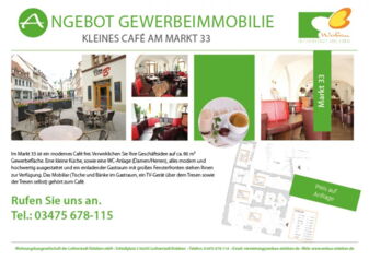 Café am Markt Im Markt 33 ist ein modernes Café frei. Verwirklichen Sie Ihre Geschäftsidee auf ca. 86 m² Gewerbefläche. Eine kleine Küche, sowie eine WC-Anlage (Damen/Herren), alles modern und hochwertig ausgestattet und ein einladender Gastraum mit großen Fensterfronten stehen Ihnen zur Verfügung. Das Mobiliar (Tische und Bänke im Gastraum, ein TV-Gerät über dem Tresen sowie der Tresen selbst) gehört zum Café.