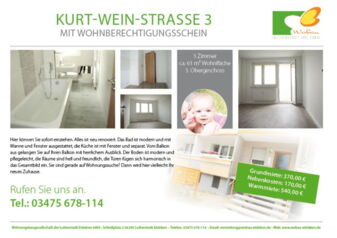Tolle 3-Raumwohnung für die kleine FamilieHier können Sie sofort einziehen. Alles ist neu renoviert. Das Bad ist modern und mit Wanne und Fenster ausgestattet, die Küche ist mit Fenster und separat. Vom Balkon aus gelangen Sie auf Ihren Balkon mit herrlichem Ausblick. Der Boden ist modern und pflegeleicht, die Räume sind hell und freundlich, die Türen fügen sich harmonisch in das Gesamtbild ein. Sie sind gerade auf Wohnungssuche? Dann wird hier vielleicht Ihr neues Zuhause. Hier gelangen Sie zum …