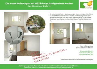 In der Karl-Wünschmann Straße können die ersten Wohnungen mit Wohnberechtigungsschein bezogen werden. Sie erhalten in der Karl-Wünschmann-Straße 13 eine komplett neu gemachte 3-Raum-Wohnung mit neuem Bad, neuem Bodenbelag und neuen Tapeten. Wenn Sie Anspruch auf einen Wohnberechtigungsschein haben, können Sie diese Wohnung anmieten. Gern informieren wir Sie. Hier geht's zur Wohnung: WBS-Wohnung in der Karl-Wünschmann-Straße 13