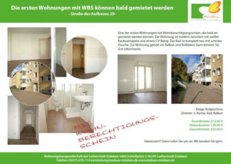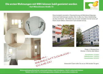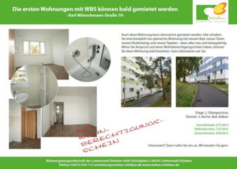 Das bieten wir: - Modern sanierte und bezugsfertige Wohnungen in all unseren Wohngebieten - günstige Mietpreise von 4,50 €/m² - voraussichtlich bezugsfertig ab Dezember/Januar Was ist ein Wohnberechtigungsschein: - Er ist für Geringverdiener - Sie erhalten damit eine Wohnung, die mit öffentlichen Mitteln gefördert wurde - Sie erhalten die Wohnung zu einem günstigeren Mietpreis, als der ortsübliche Mietpreis ist. Wo erhalten Sie einen Wohnberechtigungsschein: Den …