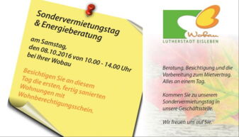 Beratung, Besichtigung und Vorbereitung zum Mietvertrag. Alles an einem Tag. Kommen Sie am Samstag, den 08. Oktober 2016 in der Zeit von 10 – 14 Uhr zu unserem Sondervermietungstag.