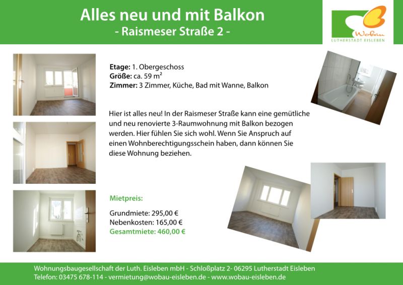 Hier ist alles neu! In der Raismeser Straße kann eine gemütliche und neu renovierte 3-Raumwohnung mit Balkon bezogen werden. Hier fühlen Sie sich wohl.Wenn Sie Anspruch auf einenWohnberechtigungsschein haben, dann können Sie diese Wohnung beziehen.