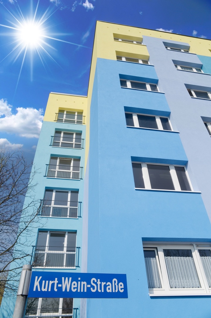 Das Objekt Kurt-Wein-Straße 9 wurde 1980 errichtet und verfügt über insgesamt 109 Wohnungen über 6 Etagen. Überwiegend befinden sich Ein-Raum-Wohnungen mit einer Größe von ca. 24 m² im Haus. Vereinzelt können auch Zwei-Raum-Wohnungen mit ca. 45-55 m² angemietet werden. Im Objekt befindet sich ein Fahrstuhl, sodass der Bezug einer Wohnung in den oberen Etagen für jede Altersgruppe kein Problem ist. Im Jahr 2015 wurde ein Vollwärmeschutz angebracht. Aufgrund der Farbauswahl der Fassade tauften wir das Haus auf den Namen "Alter Schwede".