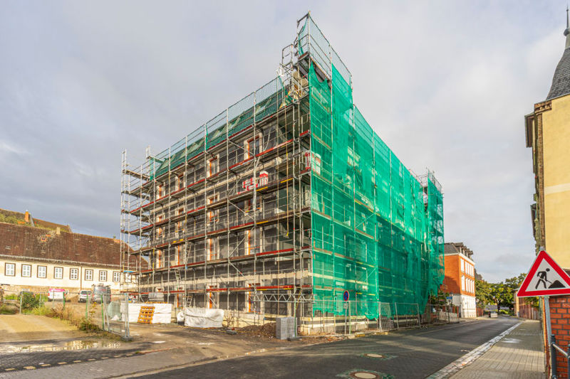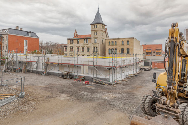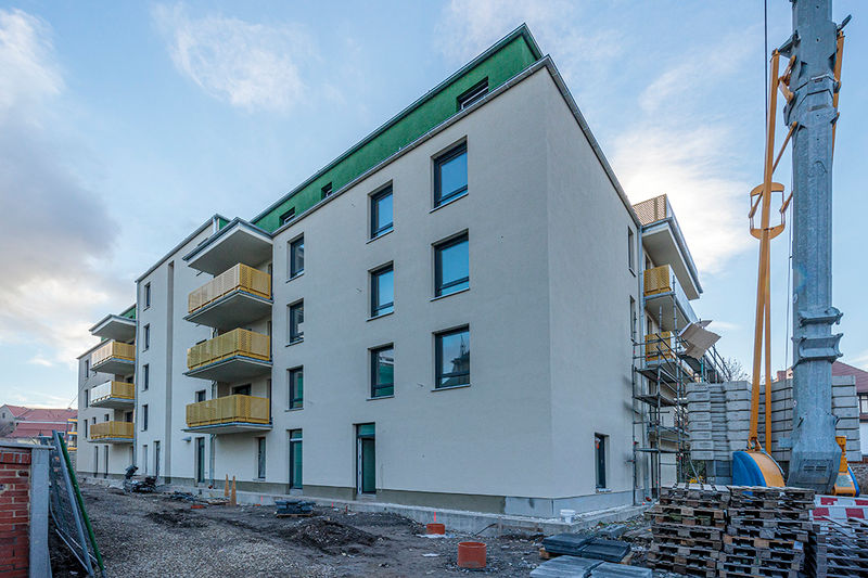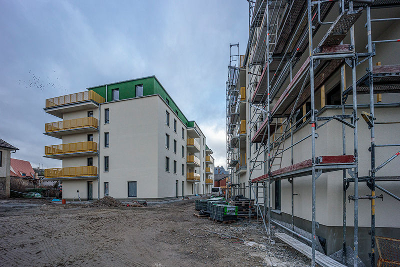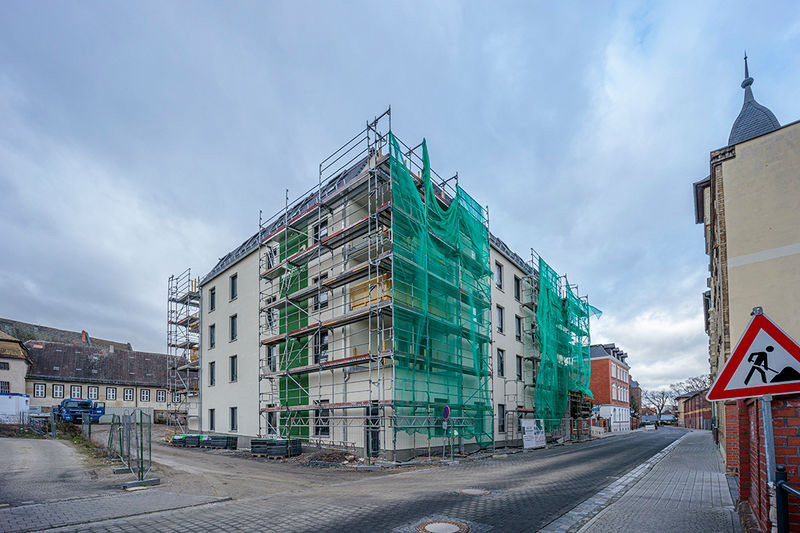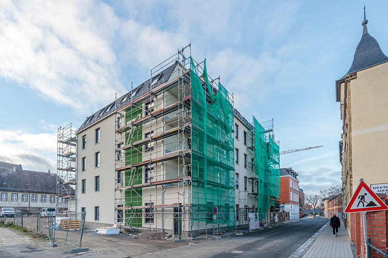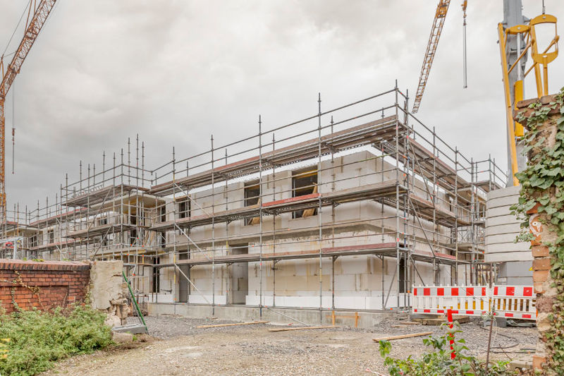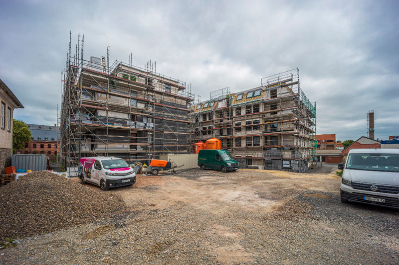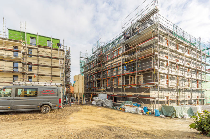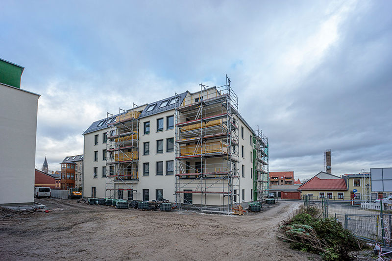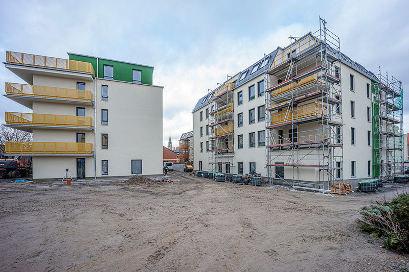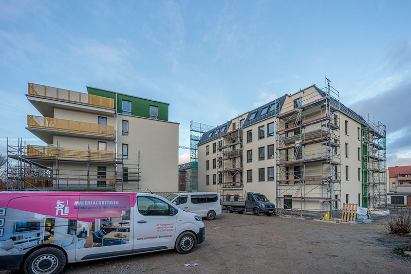 Es wird fleißig gebaut! Beide Häuser haben bereits eine farbig gestaltete Fassade in einem dezenten beige. Als Hingucker wurde ein moosgrün gewählt. Die Farbe fügt sich harmonisch in das Stadtbild ein.