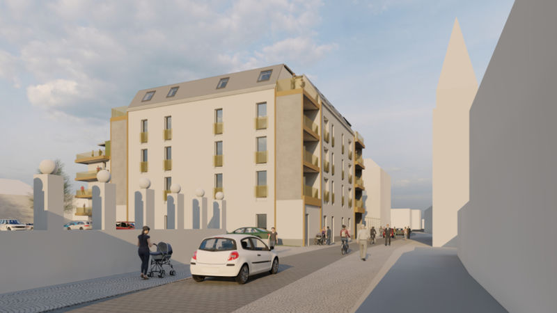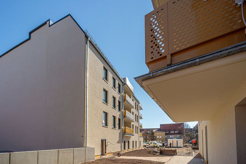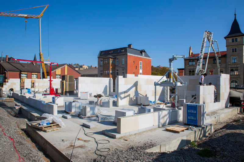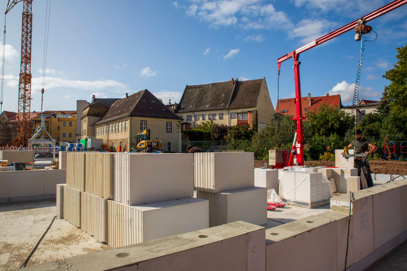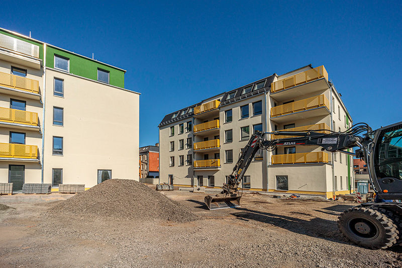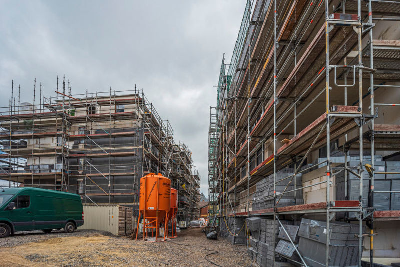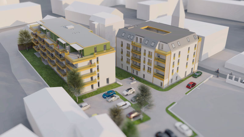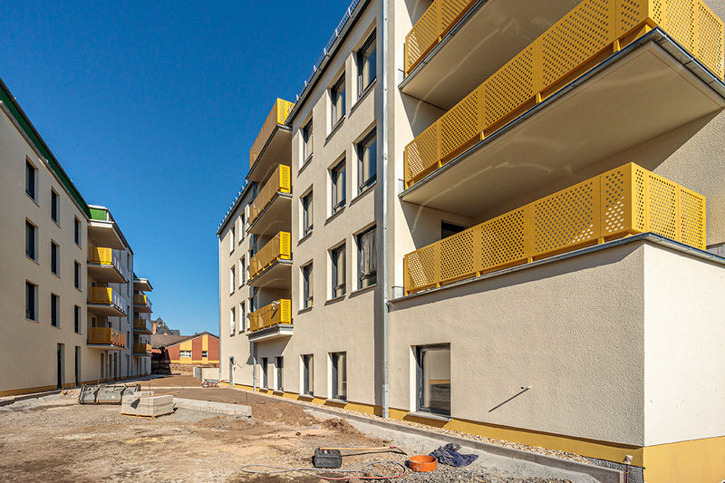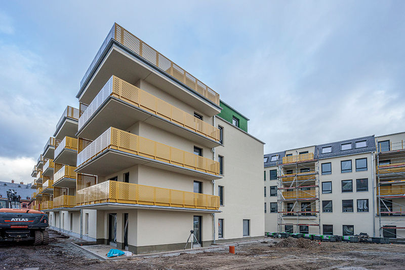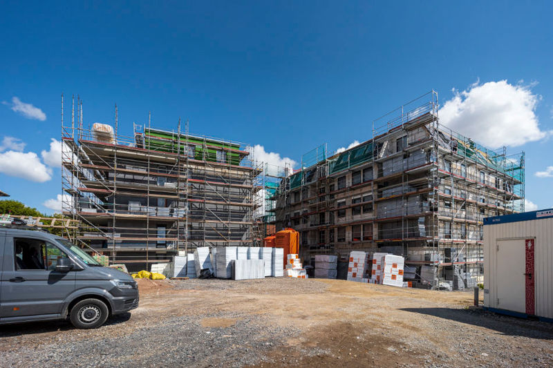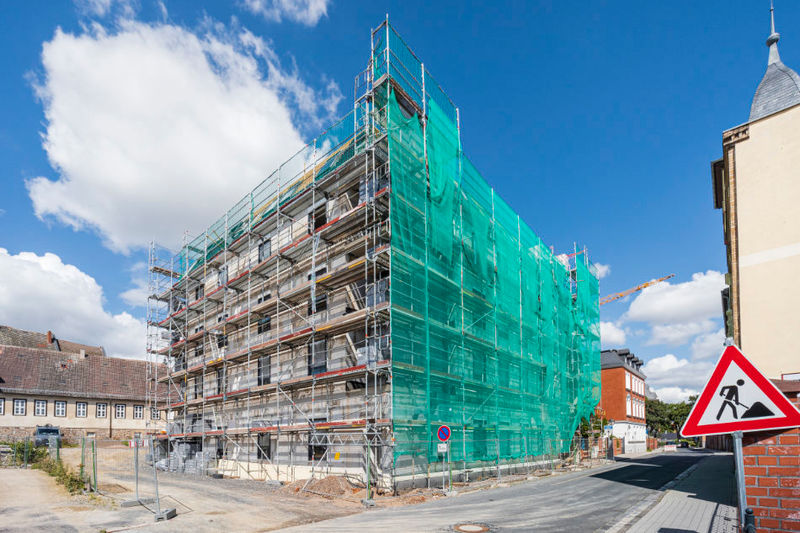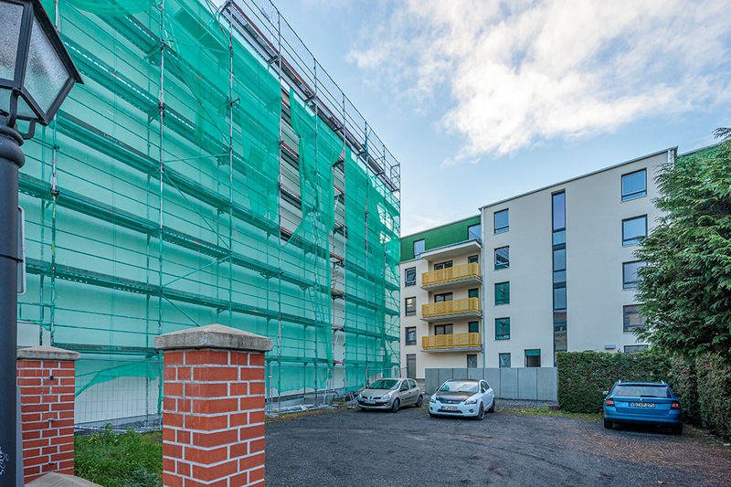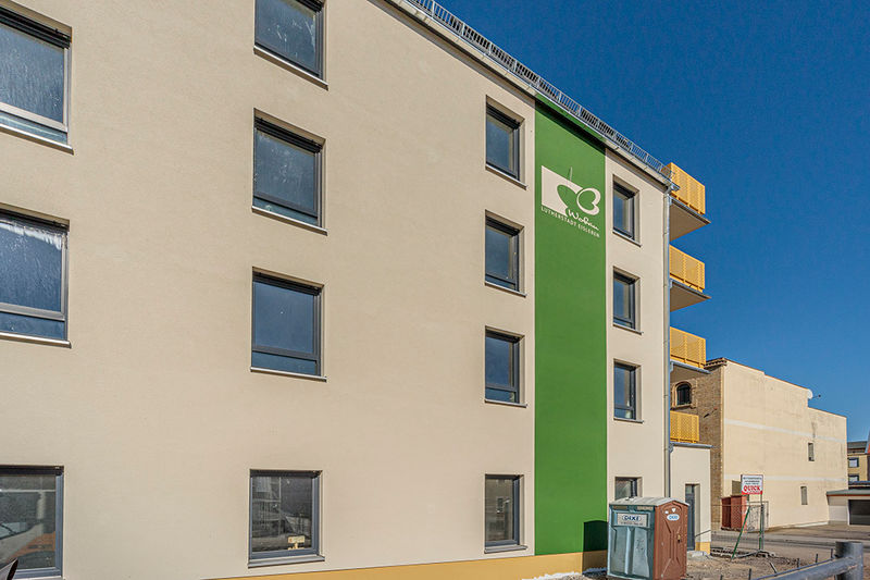 Es wird fleißig gebaut! Beide Häuser haben bereits eine farbig gestaltete Fassade in einem dezenten beige. Als Hingucker wurde ein moosgrün gewählt. Die Farbe fügt sich harmonisch in das Stadtbild ein.