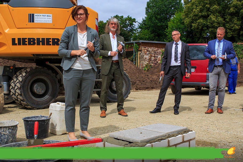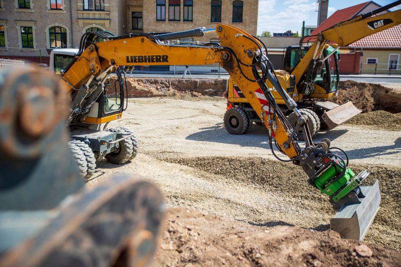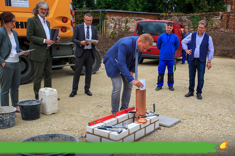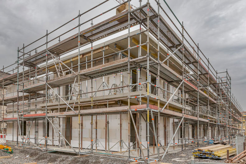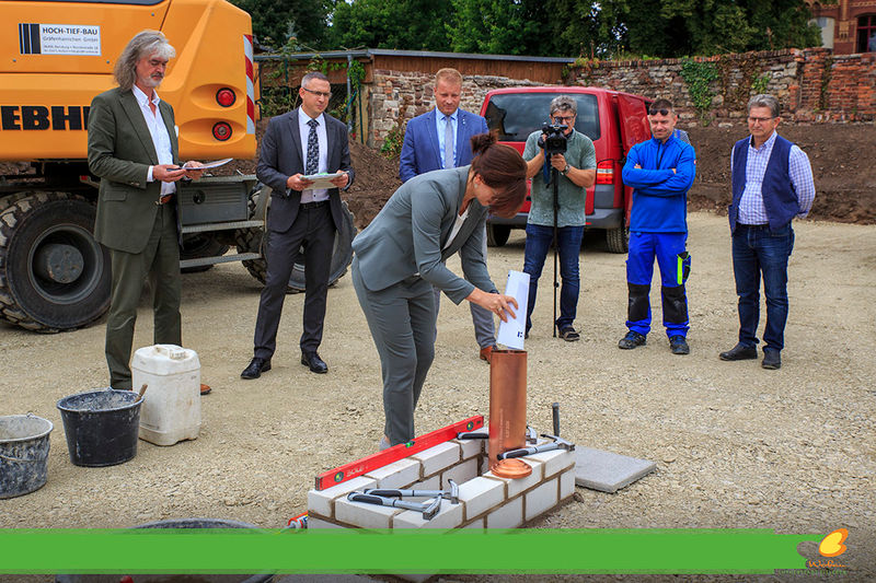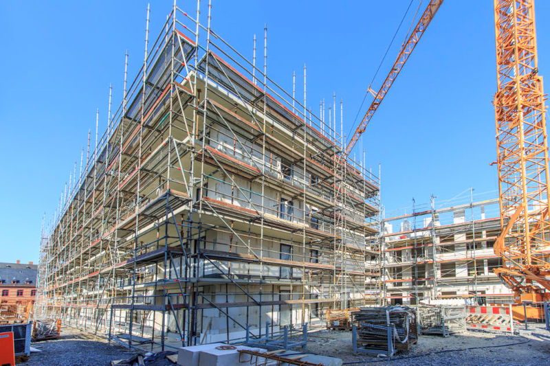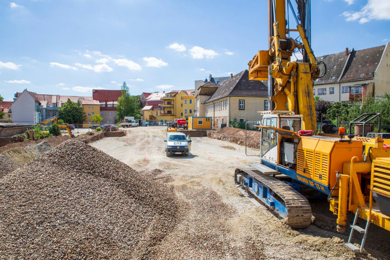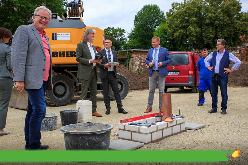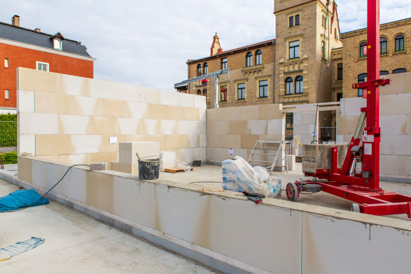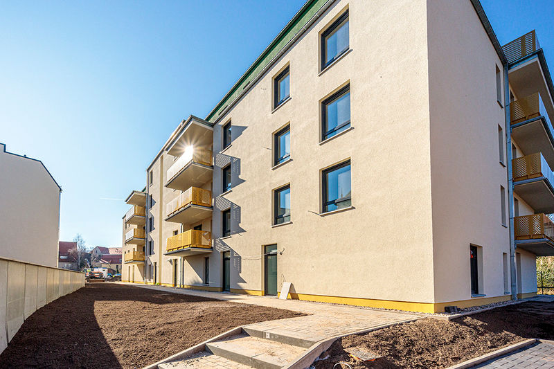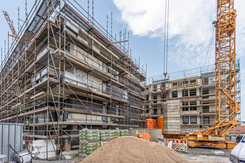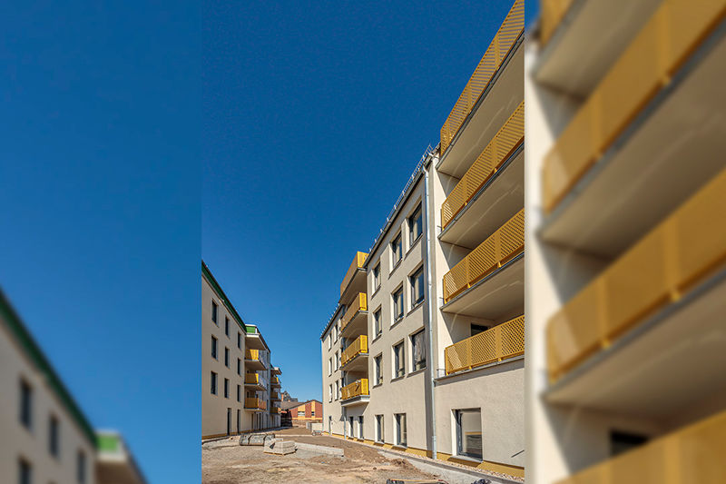 Es wird fleißig gebaut! Beide Häuser haben bereits eine farbig gestaltete Fassade in einem dezenten beige. Als Hingucker wurde ein moosgrün gewählt. Die Farbe fügt sich harmonisch in das Stadtbild ein.