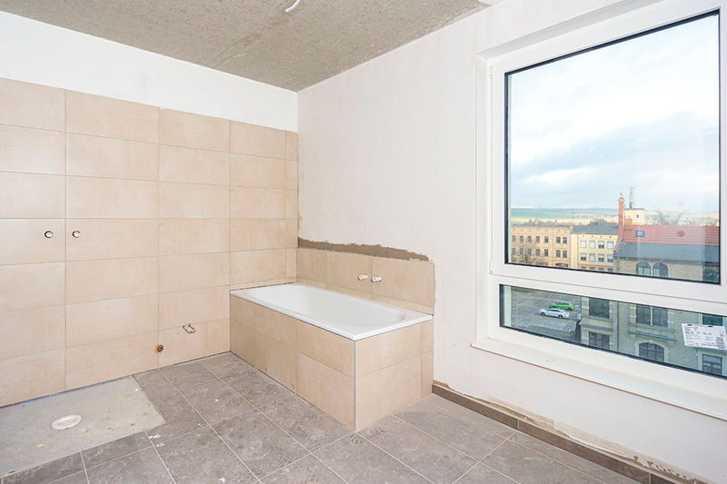 Der Innenausbau schreitet voran. Eine Musterwohnung wurde fertiggestellt. In den anderen Wohnungen wurde mit den Fliesenarbeiten begonnen. Die Wände sind verputzt, die Fußbodenheizung ist verlegt und der Fußbodenaufbau ist fertiggestellt. Auch von Außen hat sich viel getan, denn der Riegel ist komplett abgerüstet, die Balkone wurden mit einer Balkonbrüstung versehen und die Fassadengestaltung ist abgeschlossen.