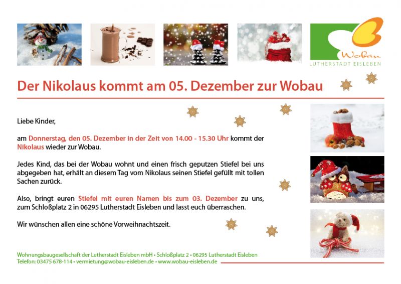 Jedes Kind, das bei der Wobau wohnt und einen frisch geputzten Stiefel bei uns abgegeben hat, erhält an diesem Tag vom Nikolaus seinen Stiefel gefüllt mit tollen Sachen zurück.