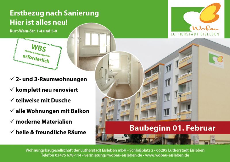 In der Kurt-Wein-Straße 1-4 und 5-8 entstehen 25 Wohnungen. Hier wird alles neu. Die Ausstattung ist modern und schick. Helle und freundliche Räume, geräumige Bäder und die modernen Materialien sprechen für sich. Es entstehen 2- sowie 3-Raumwohnungen, alle Wohnungen verfügen über einen Balkon.