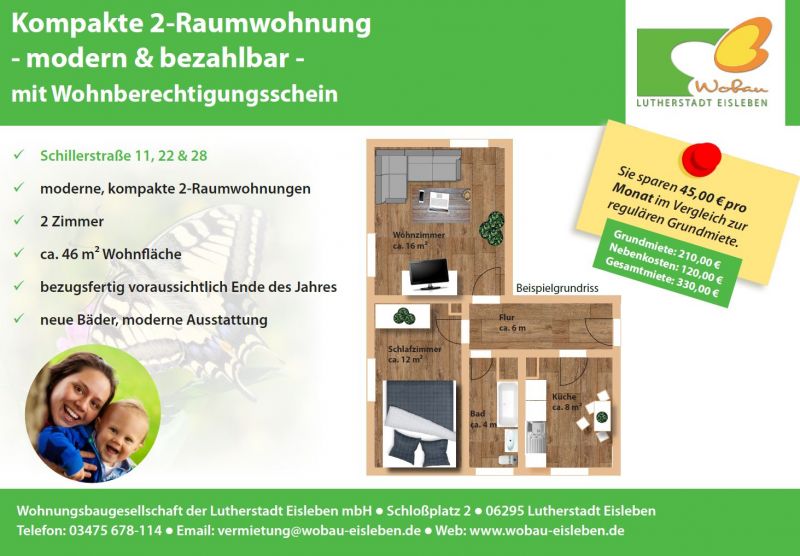 Im Zuge unserer Sommeraktion Wohnberechtigungsschein bieten wir in der Schillerstraße 11, Schillerstraße 22 und Schillerstraße 28 jeweils eine gemütliche 2-Raumwohnung mit ca. 46 m² Wohnfläche an.