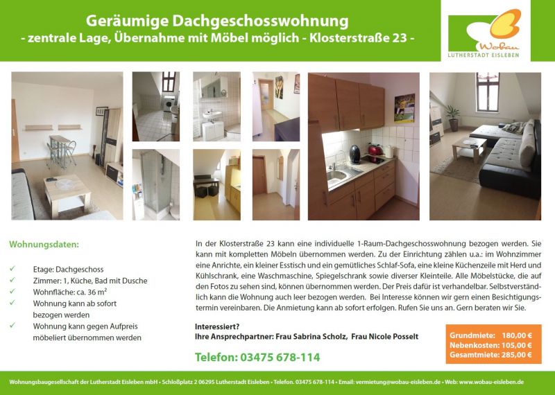 In der Klosterstraße 23 kann eine individuelle 1-Raum-Dachgeschosswohnung bezogen werden. Sie kann mit kompletten Möbeln übernommen werden. Zu der Einrichtung zählen u.a.: im Wohnzimmer eine Anrichte, ein kleiner Esstisch und ein gemütliches Schlaf-Sofa, eine kleine Küchenzeile mit Herd und Kühlschrank, eine Waschmaschine, Spiegelschrank sowie diverser Kleinteile. Alle Möbelstücke, die auf den Fotos zu sehen sind, können übernommen werden. Der Preis dafür ist verhandelbar. Selbstverständlich kann die Wohnung auch leer bezogen werden. Bei Interesse können wir gern einen Besichtigungstermin vereinbaren. Die Anmietung kann ab sofort erfolgen. Rufen Sie uns an. Gern beraten wir Sie.