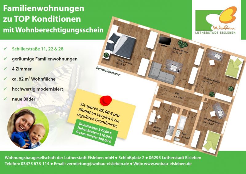 Im Zuge unserer Sommeraktion Wohnberechtigungsschein bieten wir in der Schillerstraße 11, Schillerstraße 22 und Schillerstraße 28 jeweils eine geräumige 4-Raumwohnung mit ca. 82 m² Wohnfläche an.