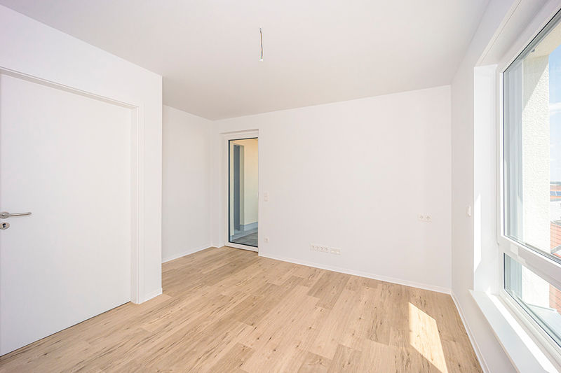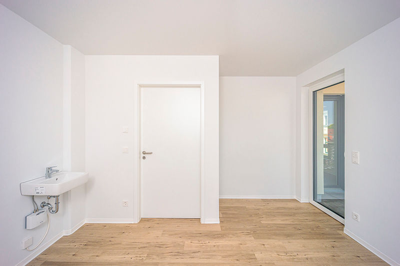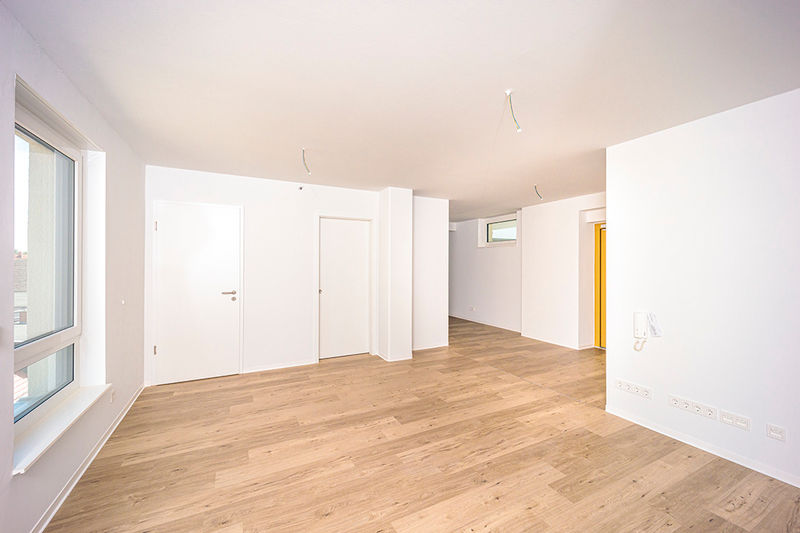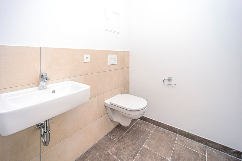 Die Praxis selbst ist hell und freundlich. Die Wände sind weiß, als Bodenbelag wurde ein robuster und pflegeleichter Designbelag in Holzoptik verlegt. Insgesamt steht eine Gewerbefläche von 151,50 m² und acht Räume zur Verfügung. Die Einheit wurde als allgemeine Arztpraxis konzipiert, einer anderweitigen Nutzung, z.B. als Büro oder Kanzlei steht jedoch ebenfalls nichts im Wege.