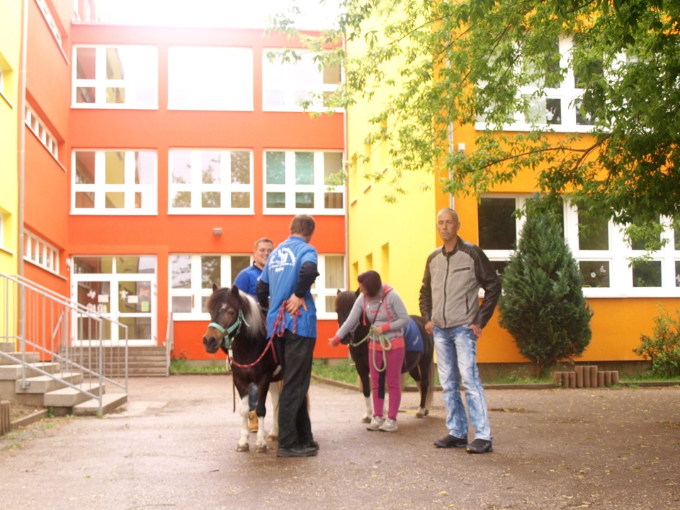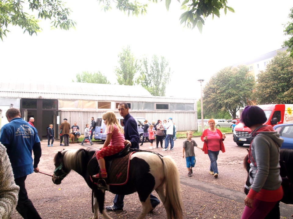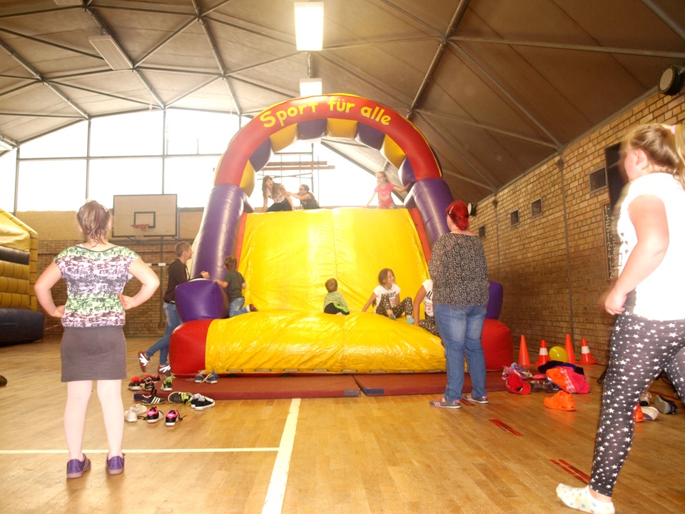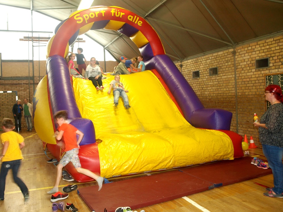 Auf dem Schulhof gab es Kinderschminken und Ponyreiten. Auch ein Kaninchen wurde vom Sport- & Reitverein Helbra mitgebracht und konnte gestreichelt und gefüttert werden. In der Sporthalle hatten die Kleinen auf der Riesenrutsche und der Hüpfburg viel Spaß beim Klettern und Toben. Und für ganz Mutige stand ein Kletterturm bereit. Die passende Musik lieferte uns Herr Wanitschek.