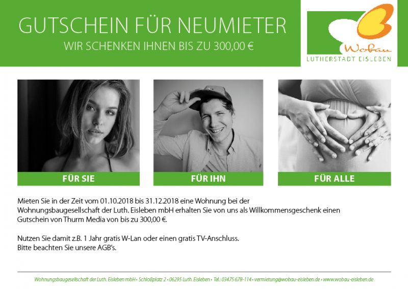 Mieten Sie in der Zeit vom 01.10.2018 bis 31.12.2018 eine Wohnung bei der Wohnungsbaugesellschaft der Lutherstadt Eisleben mbH erhalten Sie von uns als Willkommensgeschenk einen Gutschein von Thurm Media von bis zu 300,00 €.