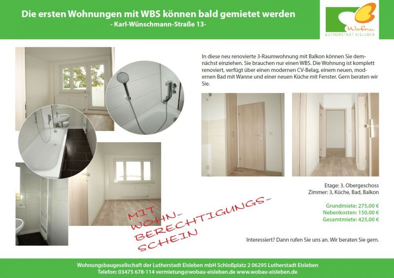 In der Karl-Wünschmann Straße können die ersten Wohnungen mit Wohnberechtigungsschein bezogen werden. Sie erhalten in der Karl-Wünschmann-Straße 13 eine komplett neu gemachte 3-Raum-Wohnung mit neuem Bad, neuem Bodenbelag und neuen Tapeten. Wenn Sie Anspruch auf einen Wohnberechtigungsschein haben, können Sie diese Wohnung anmieten. Gern informieren wir Sie. Hier geht's zur Wohnung: WBS-Wohnung in der Karl-Wünschmann-Straße 13