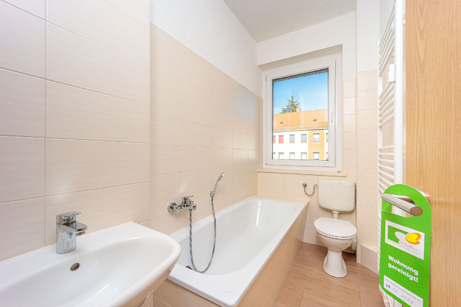 Das Badezimmer ist ebenfalls hell gestaltet, verfügt über ein Fenster für Tageslicht und eine Badewanne – perfekt zum Entspannen nach einem langen Tag.