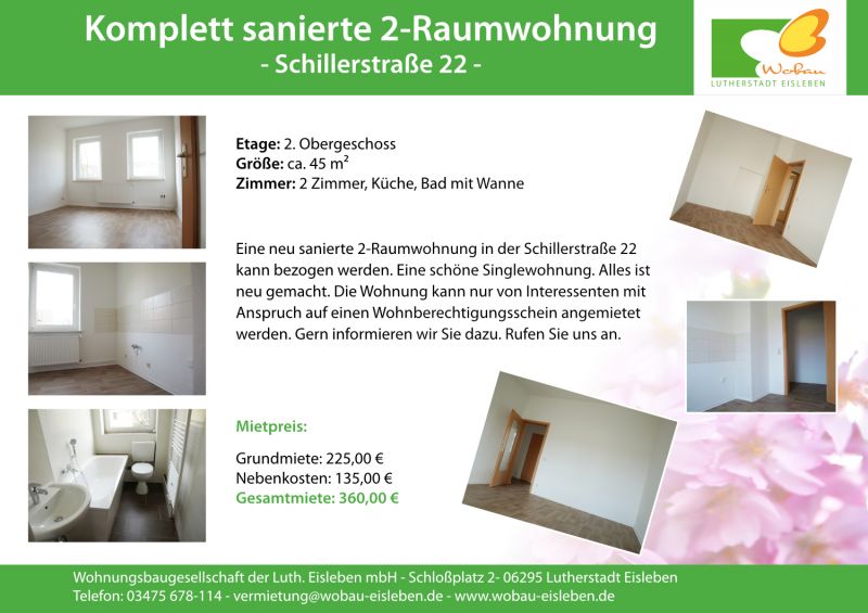 Eine neu sanierte 2-Raumwohnung in der Schillerstraße 22 kann bezogen werden. Eine schöne Singlewohnung. Alles ist neu gemacht. Die Wohnung kann nur von Interessenten mit Anspruch auf einen Wohnberechtigungsschein angemietet werden. Gern informieren wir Sie dazu. Rufen Sie uns an.