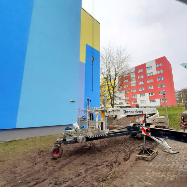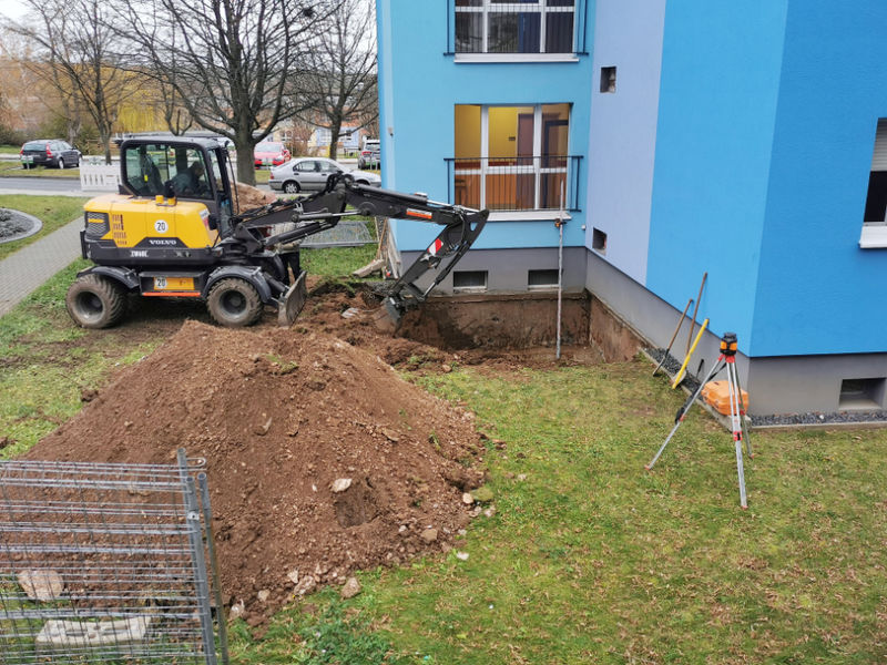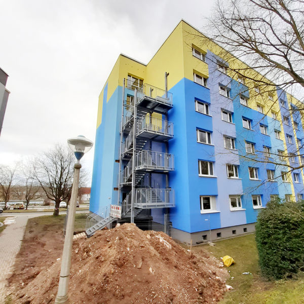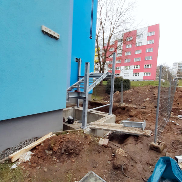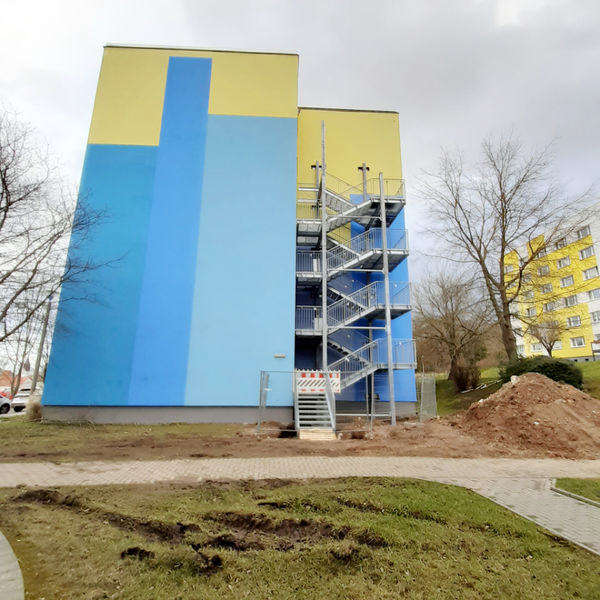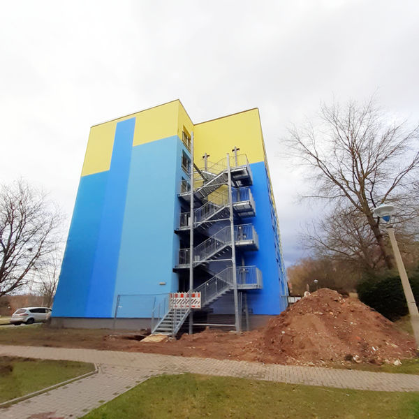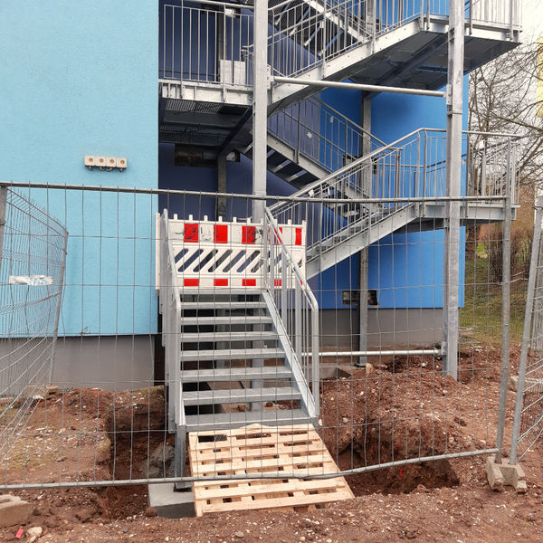 In der Kurt-Wein-Straße 9 wird zur Zeit ein zweiter Flucht- und Rettungsweg geschaffen. Auf der rechten Seite des Hauses wird an der Fassade eine Rettungstreppe angebracht, welche ermöglicht im Falle eines Brandes nach außen zu gelangen.