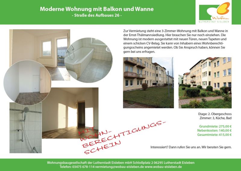 Zur Vermietung steht eine 3-Zimmer-Wohnung mit Balkon in der Ernst-Thälmannsiedlung. Hier brauchen Sie nur noch einziehen. Die Wohnung verfügt über helle Räume, einem modernen und pflegeleichten CV-Belag und einem Bad mit Fenster und Wanne. Die Küche ist separat und hat ebenfalls ein Fenster. Die Wohnung kann von Inhabern eines Wohnberechtigungsscheins angemietet werden. Ob Sie Anspruch haben, können Sie gern bei uns erfragen.