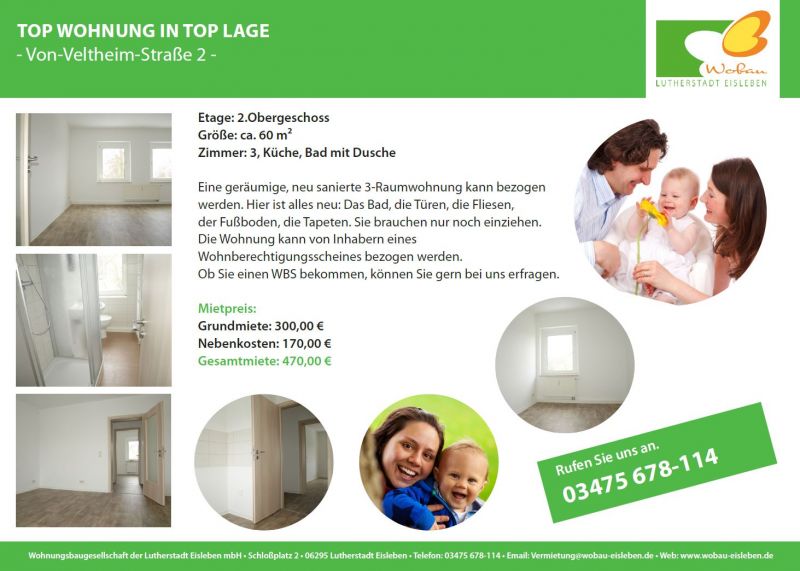 Eine geräumige, neu sanierte 3-Raumwohnung kann bezogen werden. Hier ist alles neu: Das Bad, die Türen, die Fliesen, der Fußboden, die Tapeten. Sie brauchen nur noch einziehen. Die Wohnung kann von Inhabern eines Wohnberechtigungsscheines bezogen werden. Ob Sie einen WBS bekommen, können Sie gern bei uns erfragen.