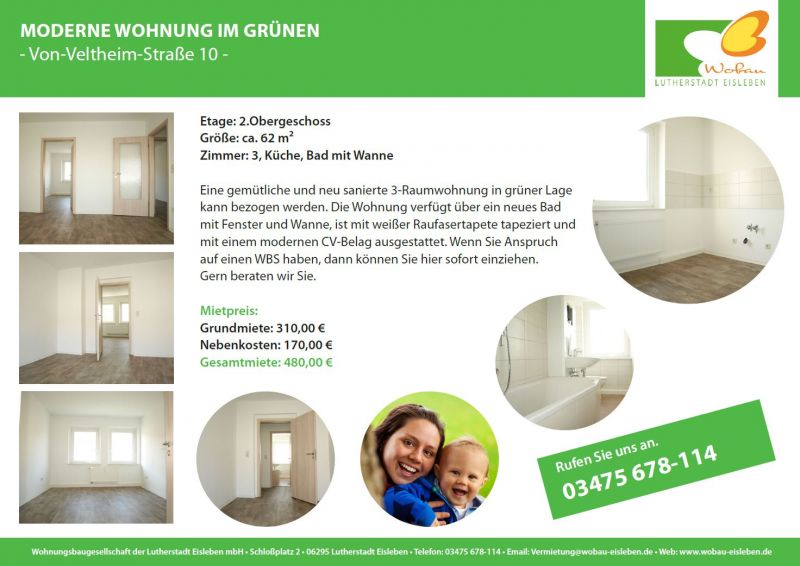 Eine gemütliche und neu sanierte 3-Raumwohnung in grüner Lage kann bezogen werden. Die Wohnung verfügt über ein neues Bad mit Fenster und Wanne, ist mit weißer Raufasertapete tapeziert und mit einem modernen CV-Belag ausgestattet. Wenn Sie Anspruch auf einen WBS haben, dann können Sie hier sofort einziehen. Gern beraten wir Sie.