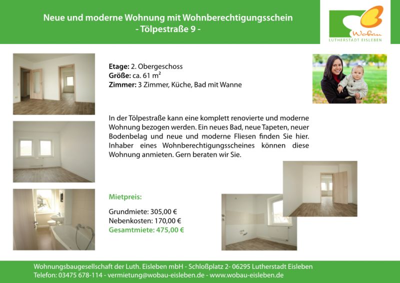 In der Tölpestraße kann eine komplett renovierte und moderne Wohnung bezogen werden. Ein neues Bad, neue Tapeten, neuer Bodenbelag und neue und moderne Fliesen finden Sie hier. Inhaber eines Wohnberechtigungsscheines können diese Wohnung anmieten. Gern beraten wir Sie.