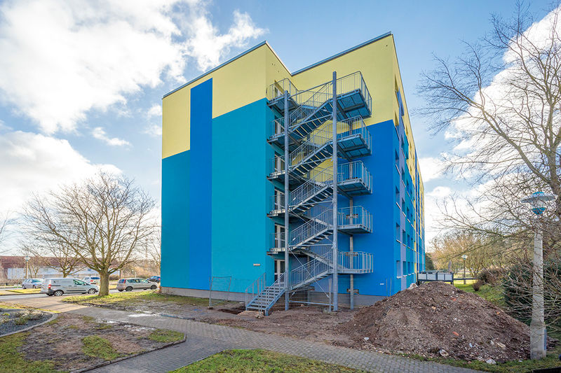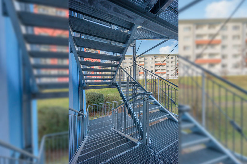 Der Anbau der Rettungstreppe in der Kurt-Wein-Straße 9 wurde fertiggestellt. Die Treppe geht vom Erdgeschoss bis in die 5. Etage.