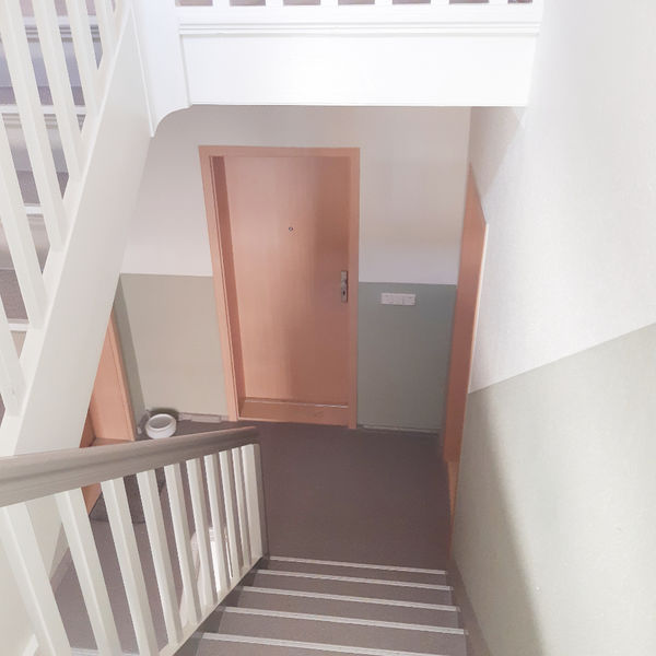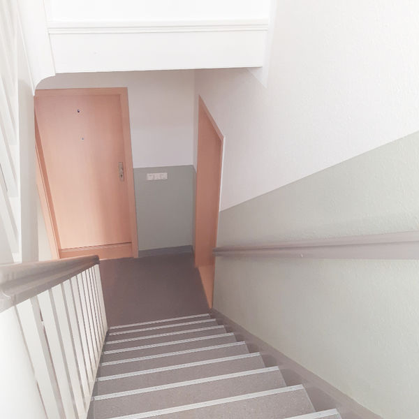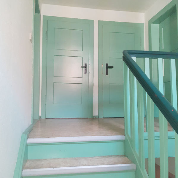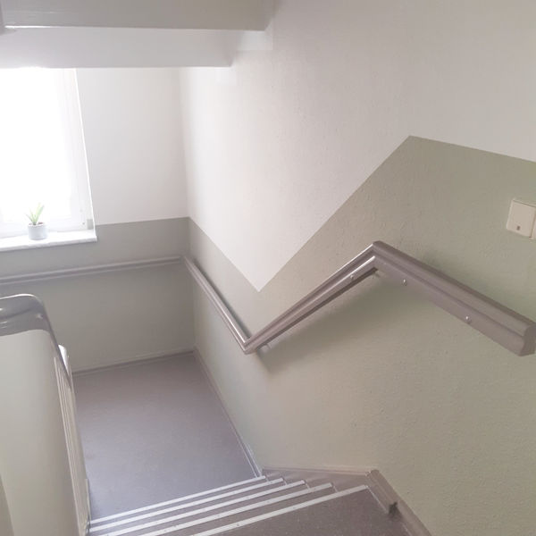 Auch in der Katharinenstraße 39 wurde das Treppenhaus neu renoviert. Die alten Tapeten wurden entfernt und durch neue ersetzt. Es erstrahlt in einem zarten grün. Passend dazu wurde das Treppengeländer neu gestrichen und der Bodenbelag gegen einen hochwertigen PVC-Belag getauscht.